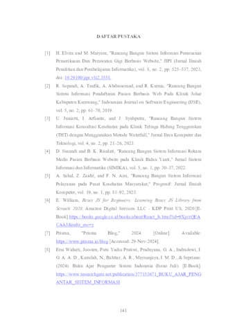 Klinik drg. Irna merupakan klinik kesehatan gigi yang masih menggunakan sistem semi-manual dalam pendaftaran pasien dan pencatatan rekam medis. Proses ini menimbulkan berbagai kendala seperti kesulitan pencarian dokumen, kesalahan pencatatan, serta kesulitan dalam pengelolaan data pasien. Penelitian ini bertujuan untuk merancang dan membangun sistem informasi layanan klinik berbasis website yang dapat mengintegrasikan proses administrasi seperti pendaftaran, penjadwalan janji temu, pengelolaan rekam medis, dan fitur konsultasi online. Sistem dikembangkan menggunakan metode Software Development Life Cycle (SDLC) model Waterfall, dengan implementasi teknologi ReactJS pada sisi frontend, Tailwind CSS untuk desain antarmuka, serta Prisma ORM dan PostgreSQL pada sisi backend. Pengujian sistem dilakukan menggunakan metode Black Box Testing dengan 48 test case dan seluruhnya berhasil dijalankan sesuai dengan fungsionalitas yang diharapkan. Selain itu, berdasarkan hasil User Acceptance Testing (UAT) yang melibatkan pengguna sistem, diperoleh nilai rata-rata sebesar 88,47%, yang menunjukkan bahwa sistem telah memenuhi kebutuhan pengguna dan dapat digunakan dengan baik pada layanan Klinik drg. Irna.