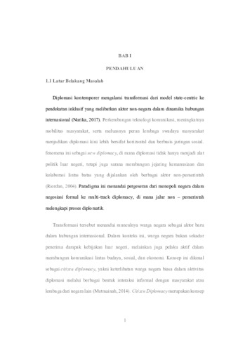 Citizen diplomacy refers to the involvement of non-state actors in diplomatic practices traditionally dominated by official state institutions. In this context, Yayasan Mudra Swari Saraswati, through the organization of the Ubud Writers & Readers Festival (UWRF), represents a concrete example of citizen diplomacy in the field of culture and literature. This annual international literary festival, held in Ubud, Bali, aims to bring together writers, readers, and creative industry actors from various countries into a shared space for global dialogue. Since its consistent implementation, UWRF has gone beyond literary discussions by featuring artistic performances, book launches, and thematic programs addressing humanitarian, environmental, and global political issues. This study employs a descriptive method with a qualitative approach, utilizing primary data from interviews and secondary data from literature review and social media analysis. The research focuses on the period from 2020 to 2025, highlighting the evolving themes and the festival’s expanding role in responding to global challenges. The analysis applies the concept of citizen diplomacy and draws on the typology of citizen diplomats proposed by Paul Sharp, particularly three key roles. The findings indicate that UWRF serves as an effective platform for fostering people-to-people contact, strengthening cultural exchange, and enhancing Indonesia’s international image through the active participation of non-state actors. Keywords : Citizen diplomacy, Yayasan Mudra Swari Saraswati, Ubud Writers and Readers Festival