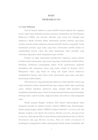 Mahasiswa seringkali mengalami kesulitan dalam mengelola berbagai tugas akademik, organisasi, dan kegiatan lainnya yang memiliki deadline padat dan tingkat kesulitan berbeda, sehingga menyebabkan penurunan produktivitas dan peningkatan stres. Untuk mengatasi masalah ini, dikembangkan aplikasi SKEGO berbasis Android menggunakan bahasa pemrograman Kotlin dan algoritma machine learning model Multi-Layer Perceptron (MLP), yang membantu mahasiswa memprioritaskan tugas berdasarkan faktor seperti deadline, tingkat kesulitan, dan estimasi durasi pengerjaan. Aplikasi ini dirancang dengan fitur manajemen tugas yang dapat memberikan rekomendasi prioritas tugas dan fitur rutinitas dengan kalender. Aplikasi ini dapat meningkatkan produktivitas mahasiswa dan mengurangi stres akibat penundaan tugas dengan memberikan rekomendasi pengerjaan tugas.