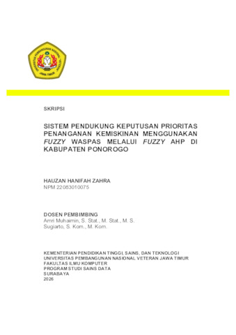 Zahra, Hauzan Hanifah (2026) Sistem Pendukung Keputusan Prioritas Penanganan Kemiskinan Menggunakan Fuzzy WASPAS melalui Fuzzy AHP di Kabupaten Ponorogo. Undergraduate thesis, UPN Veteran Jawa Timur.