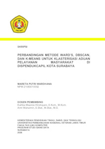 Wardhana, Mareta Putri (2026) Perbandingan Metode Ward’s, DBSCAN, Dan K-Means Untuk Klasterisasi Aduan Pelayanan Masyarakat Di Dispendukcapil Kota Surabaya. Undergraduate thesis, UPN Veteran Jawa Timur.