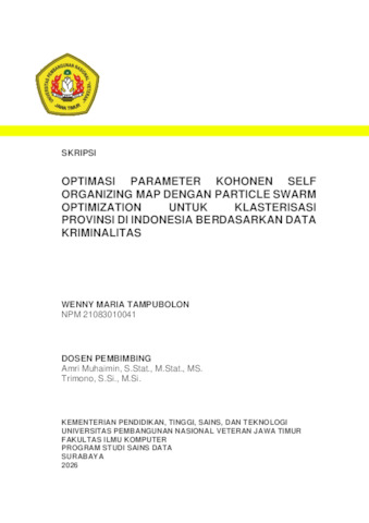 Tampubolon, Wenny Maria (2026) Optimasi Parameter Kohonen Self Organizing Map Dengan Particle Swarm Optimization Untuk Klasterisasi Provinsi Di Indonesia Berdasarkan Data Kriminalitas. Undergraduate thesis, UPN Veteran Jawa Timur.