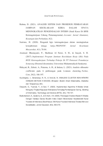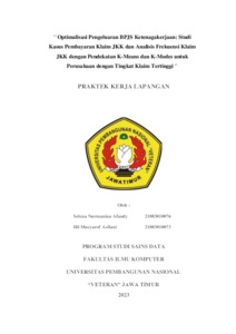 afandy, selena nurmanina and Asfiani, Ilil Musyarof (2024) Optimalisasi Pengeluaran BPJS Ketenagakerjaan: Studi Kasus Pembayaran Klaim JKK dan Analisis Frekuensi Klaim JKK dengan Pendekatan K-Means dan K-Modes untuk Perusahaan dengan Tingkat Klaim Tertinggi. Project Report (Praktek Kerja Lapang dan Magang). UPN VETERAN JAWA TIMUR. (Unpublished)