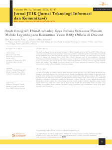 Putri, Dea Rahmanda and Achmad, Zainal Abidin (2026) Studi Etnografi Virtual terhadap Gaya Bahasa Sarkasme Pemain Mobile Legends pada Komunitas Team RRQ Official di Discord. Jurnal JTIK (Jurnal Teknologi Informasi dan Komunikasi), 10 (1). pp. 92-97. ISSN 2580-1643