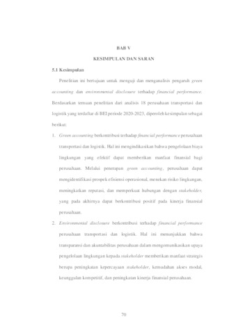 This study examines the effect of green accounting and environmental disclosure on the financial performance of transportation and logistics companies listed on the Indonesia Stock Exchange (IDX) from 2020 to 2023. It uses a quantitative approach. The sample includes 18 companies selected by purposive sampling. Data analysis applies multiple regression with SPSS. The results show green accounting and environmental disclosure have a positive and significant impact on financial performance.