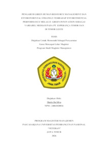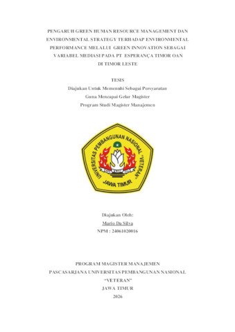 DA SILVA, MARIO (2026) PENGARUH GREEN HUMAN RESOURCE MANAGEMENT DAN ENVIRONMENTAL STRATEGY TERHADAP ENVIRONMENTAL PERFORMANCE MELALUI GREEN INNOVATION SEBAGAI VARIABEL MEDIASI PADA PT ESPERANÇA TIMOR OAN DI TIMOR LESTE. Undergraduate thesis, UPN "veteran" jawa timur.